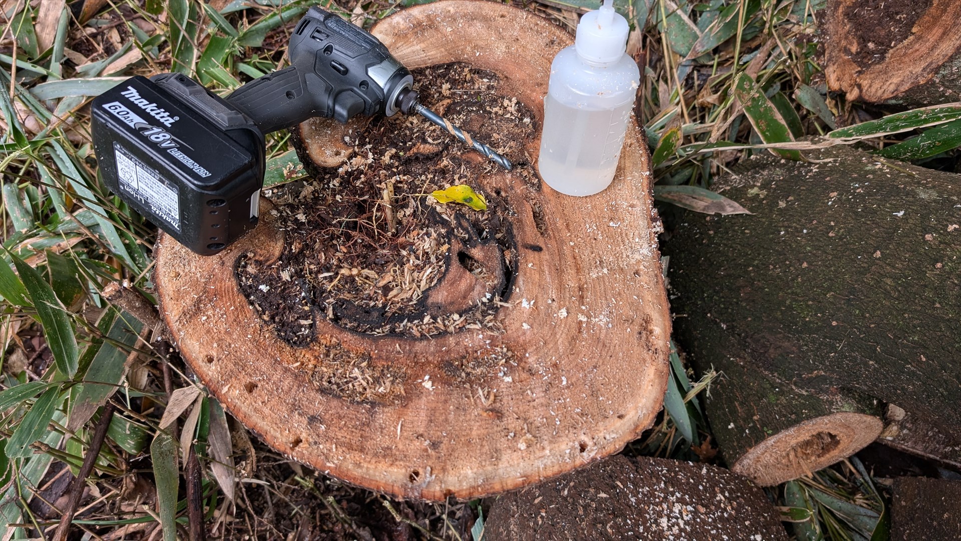 桐の木は中が枯れて空洞になっておりましたが、登っている間はワイヤーを掛けて倒れ防止をしていたので問題は有りませんでした。伐倒後は切り株には除草剤の原液を注入して処理。